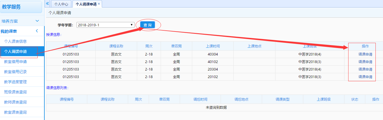 第四步:查询出课程后,选择需要调整的课程,点击右边调课申请