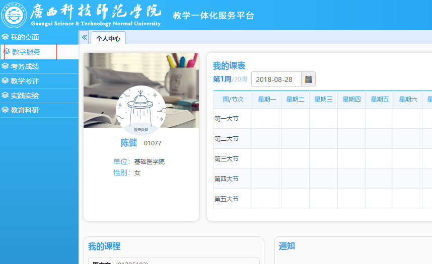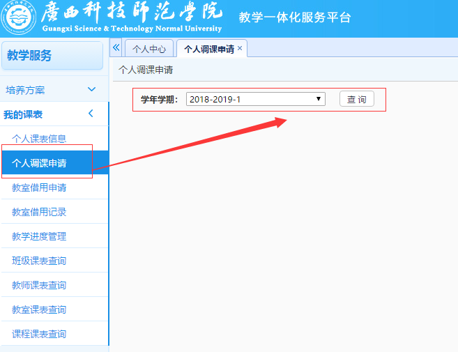 第三步:进入→我的课表(双击)→选择学期学年(点击查询)