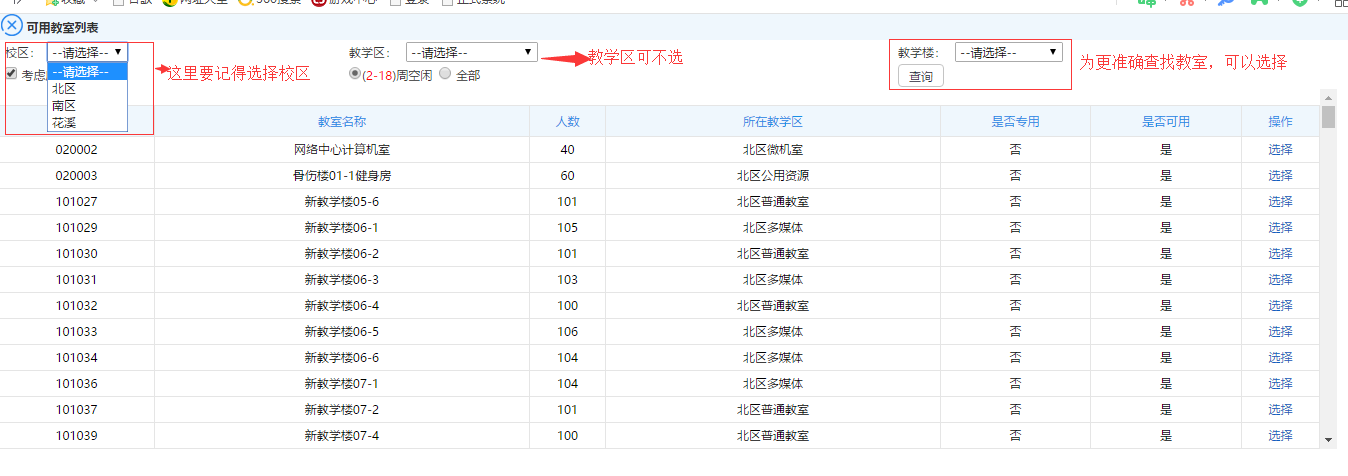 地点:点击“可用教室”按钮进入后,校区要选,然后找到所需要的教室点击右边的“选择”