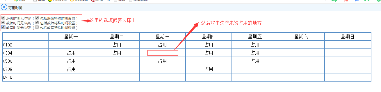 时间:点击“可用时间”按钮进入后双击没有“占用”标识的课节即可