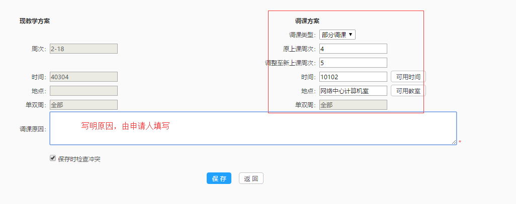 系统提供的调课类型有:整体调课(1-18周时间、地点全调)、部分调课(部分周次的时间地点同时调)、停课。停课后可以通过补课操作重新开放课程课表。管理端能进行整体变更教师申请。