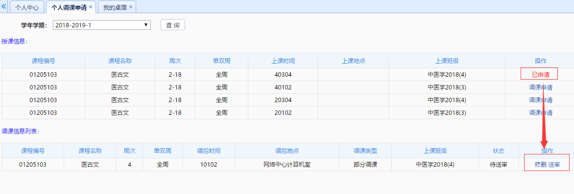 第六步:保存完成后要送审,在下方的调课信息列表中就有调课申请信息,点击“送审”,送给刘红经理审核,完成调课申请。