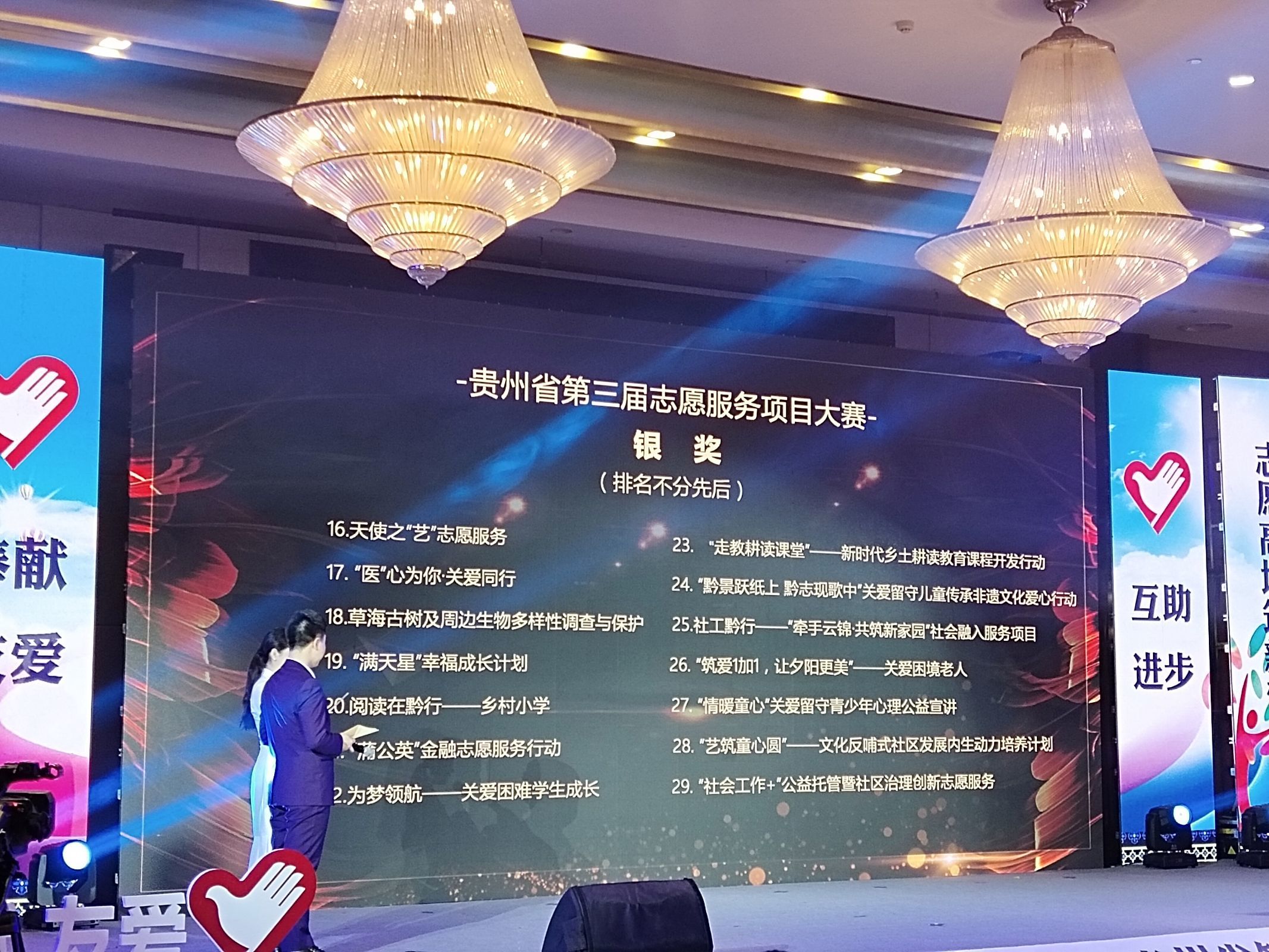 11月28日大赛展开布展。《天使之“艺”--志愿服务》服务团队到达桔山广场开始布展现场。11月29日,大赛进行开幕式、及路演答辩。开幕式结束后,进行志愿服务项目路演答辩。11月30日,由出席的领导同志巡展、提问、交流,经过三天的精彩角逐大赛渐渐拉下了帷幕,于中午在兴义富康国际会展中心兴义厅举行贵州省第三届志愿服务项目大赛闭幕式暨颁奖典礼。