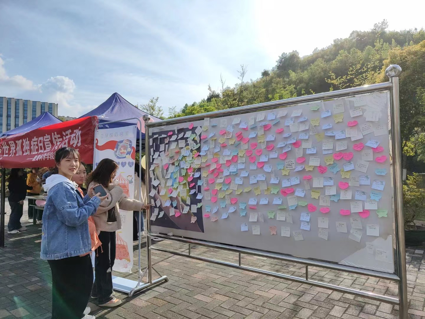 本次活动呼吁校园师生更加深入认识自闭症,并给予自闭症儿童一个公平、包容、关爱的环境。活动中,路过的师生参与了有奖竞答、自制或领取蓝丝带、寄语等活动项目,还通过查看展板信息与询问工作人员的方式来了解自闭症的相关信息。竞答成功的师生获得了精美小礼品。参与活动的“星宝”志愿者,并有老师陪伴志愿者保证其安全,让其接触外界,感受到他人的关爱与支持。