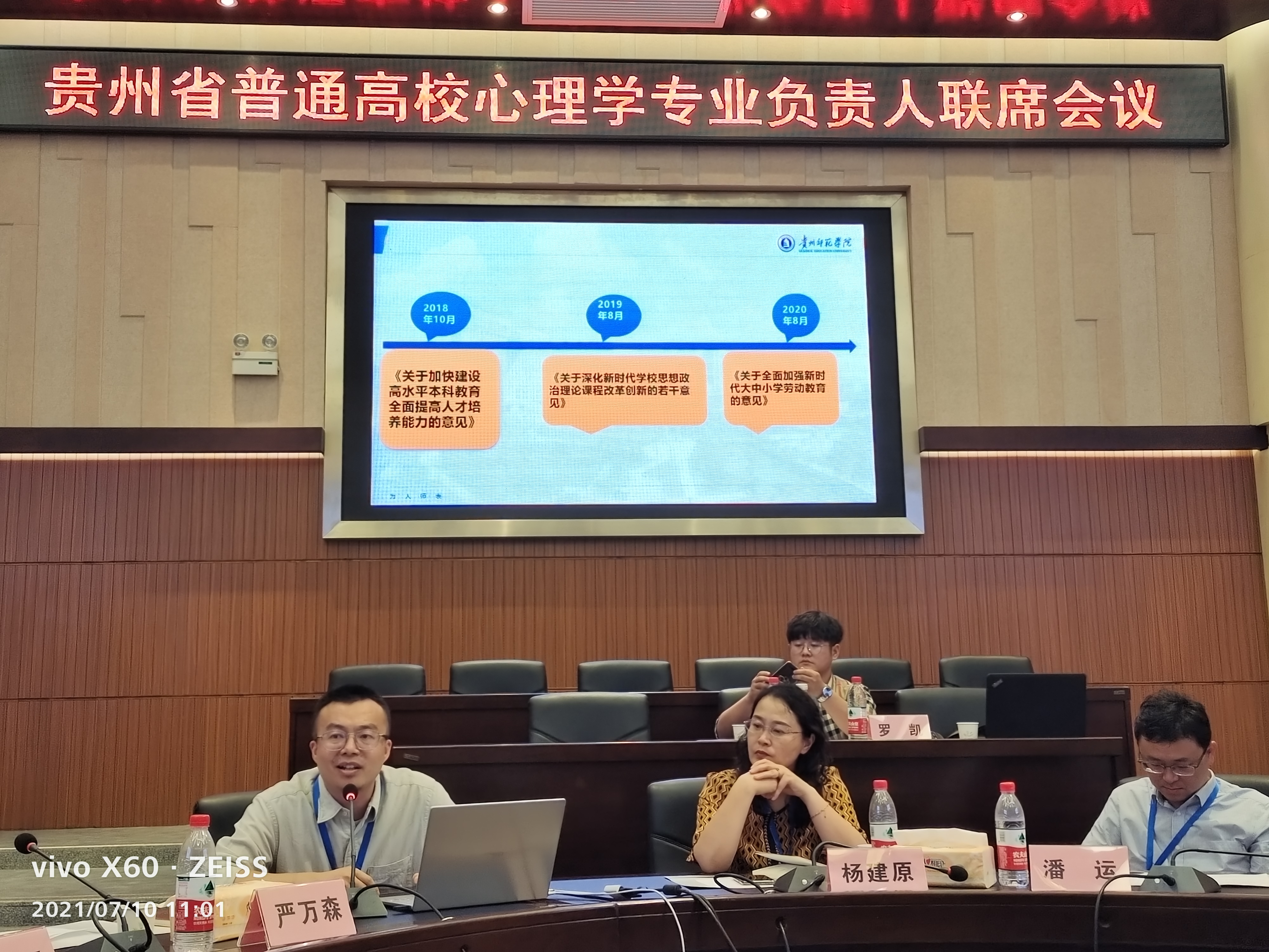为促进贵州省心理学专业建设,实现心理学人才培养的高质量发展,2021年7月10日上午九点,由贵州师范大学心理公司组织的第一届贵州省普通高校心理学专业负责人联席会议在贵州师范大学会议中心召开,会议由贵州师范大学心理学经理潘运教授主持,bevictor伟德官网经理刘红、应用心理学系系主任罗凯及教师代表倪磊参加了此次会议,与来自贵州师范大学、贵州医科大学、贵州民族大学等心理系专业负责人及相关教师代表,共同研讨心理学专业人才培养方案及建设经验交流。