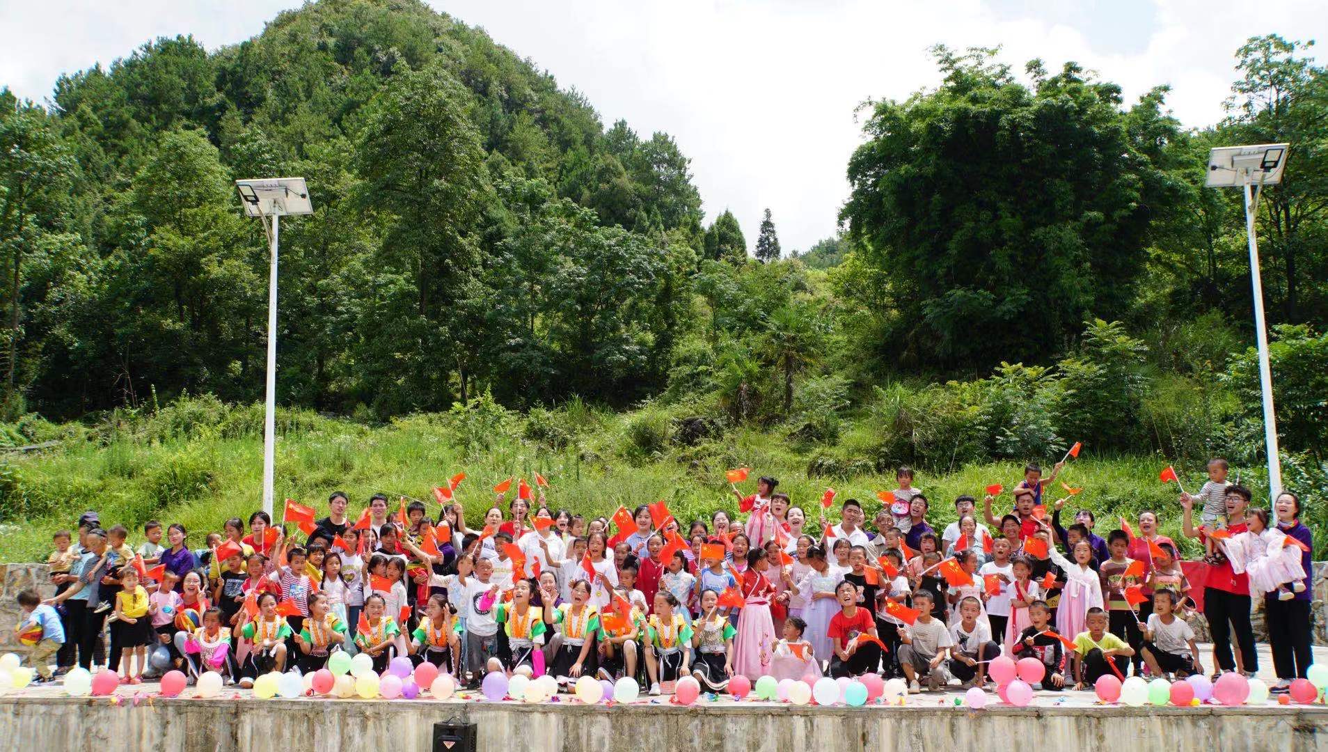 志愿团队开展了丰富多彩的文艺活动,其中包括应用心理学专业员工组织的团辅活动和曼陀罗绘画以及基本礼仪教学、学前教育专业员工组织丰富多样的课程(音乐课、舞蹈课、篮球课、花样跳绳课)以及带领小朋友们表演红色经典儿童剧、特殊教育专业员工组织的手语课和普通话课、艺术教育专业员工组织的党史拼图绘画。同时,志愿团队在走访村民过程中宣讲党史故事、普及普通话、为村民打扫卫生、做农活、拍全家福,还为该村绘制富有民族特色的墙绘、打造舞蹈教室。此外,当地村民为志愿团队表演芦笙伴奏舞蹈,小朋友们教志愿者们说苗语、跳苗舞、吹芦笙以及体验田间生活。最后,志愿团队基于整体的教学活动举办了一场隆重的文艺汇演,以全体大合唱《没有共产党就没有新中国》为“三下乡”暑期社会实践活动画上圆满的句号。