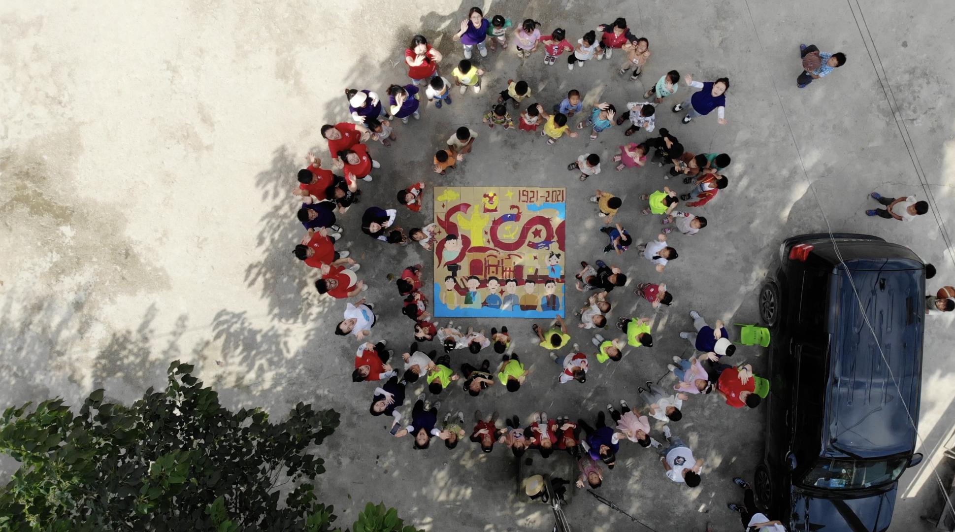 志愿者带领小朋友们党史拼图