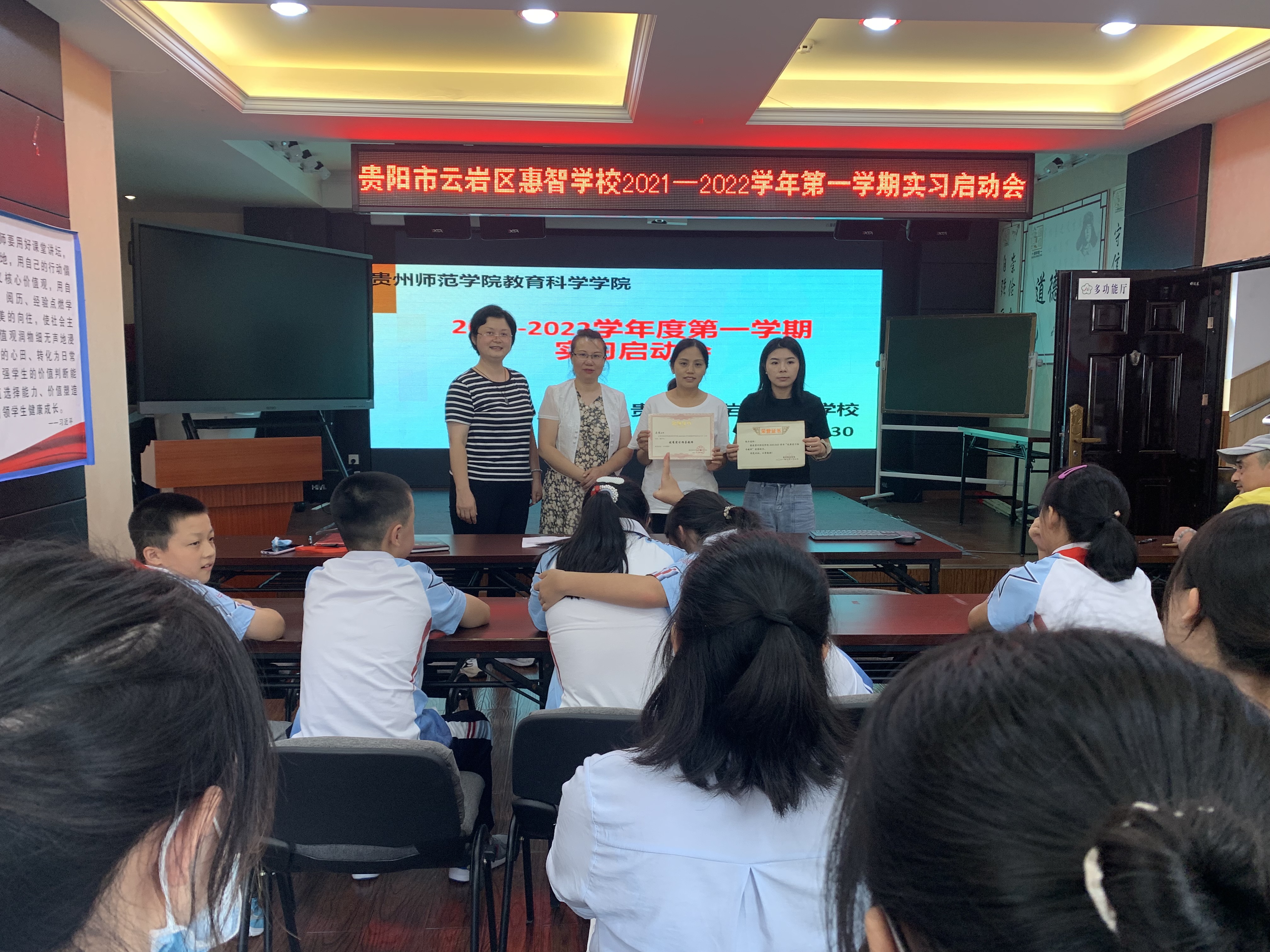 首先,夏卉芳老师和云岩区惠智公司赵校瑛主任给云岩区惠智公司陈丹、马琴2位老师颁发bevictor伟德官网2020-2021学年度校外优秀实习指导教师荣誉证书。