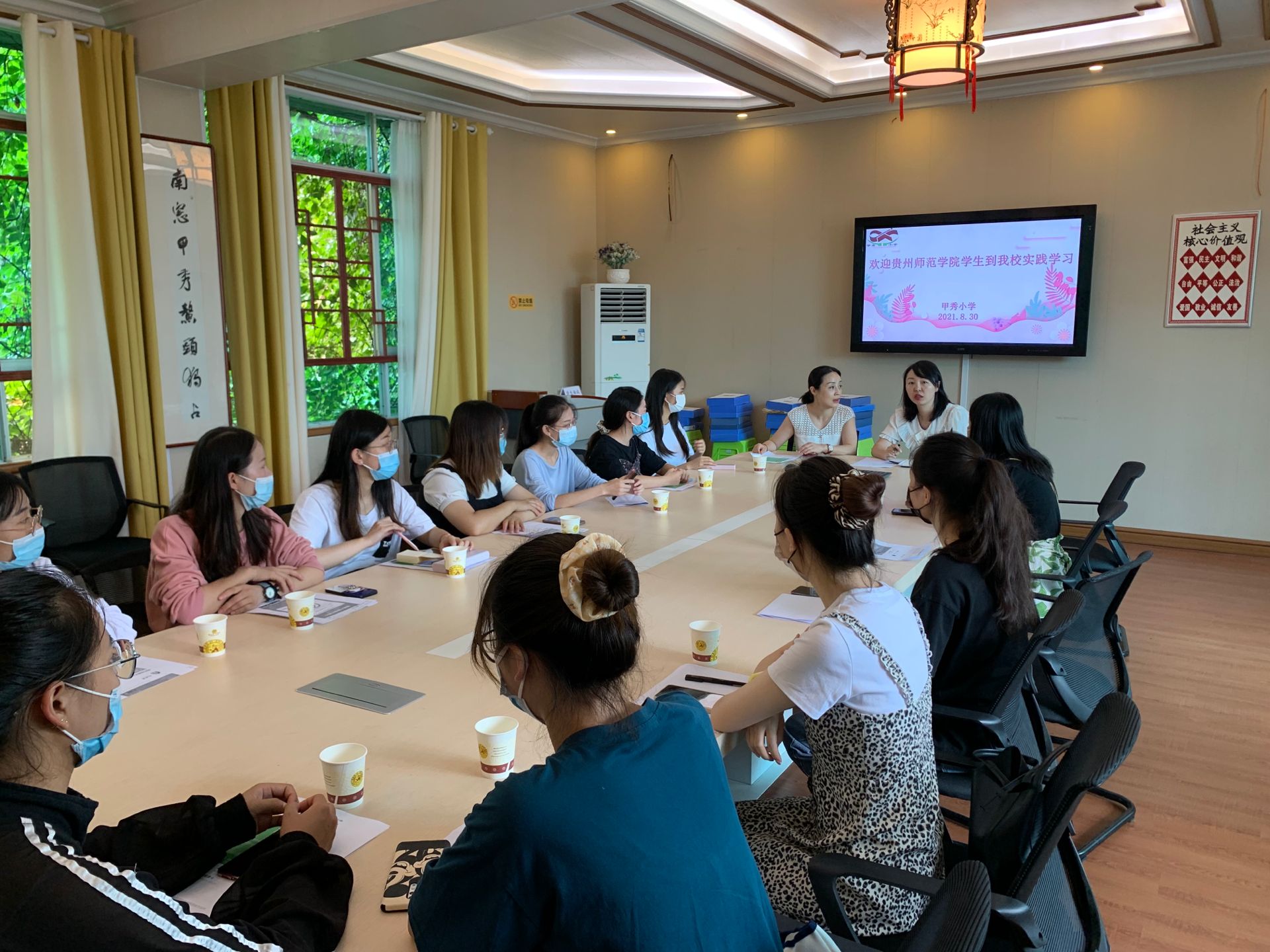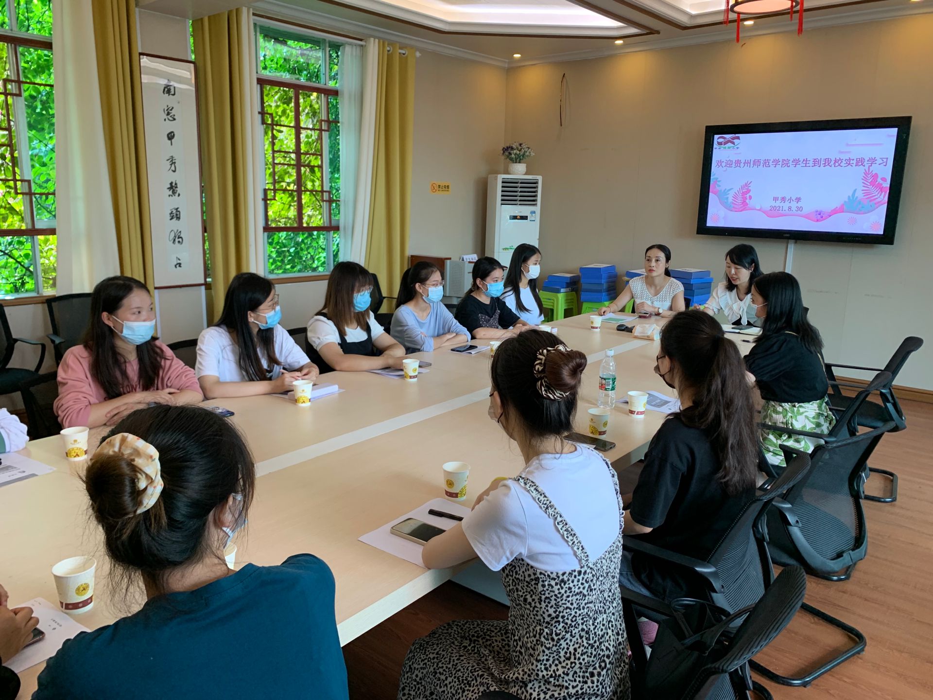 2021年8月30日下午2点,饶畅老师带领艺术教育专业12名同学到甲秀小学一校区实习报到,并开展甲秀小学实习指导教师培训交流。参加本次会议的有甲秀小学一校区的邓董事长、梁董事长、黄主任以及全体实习指导老师。