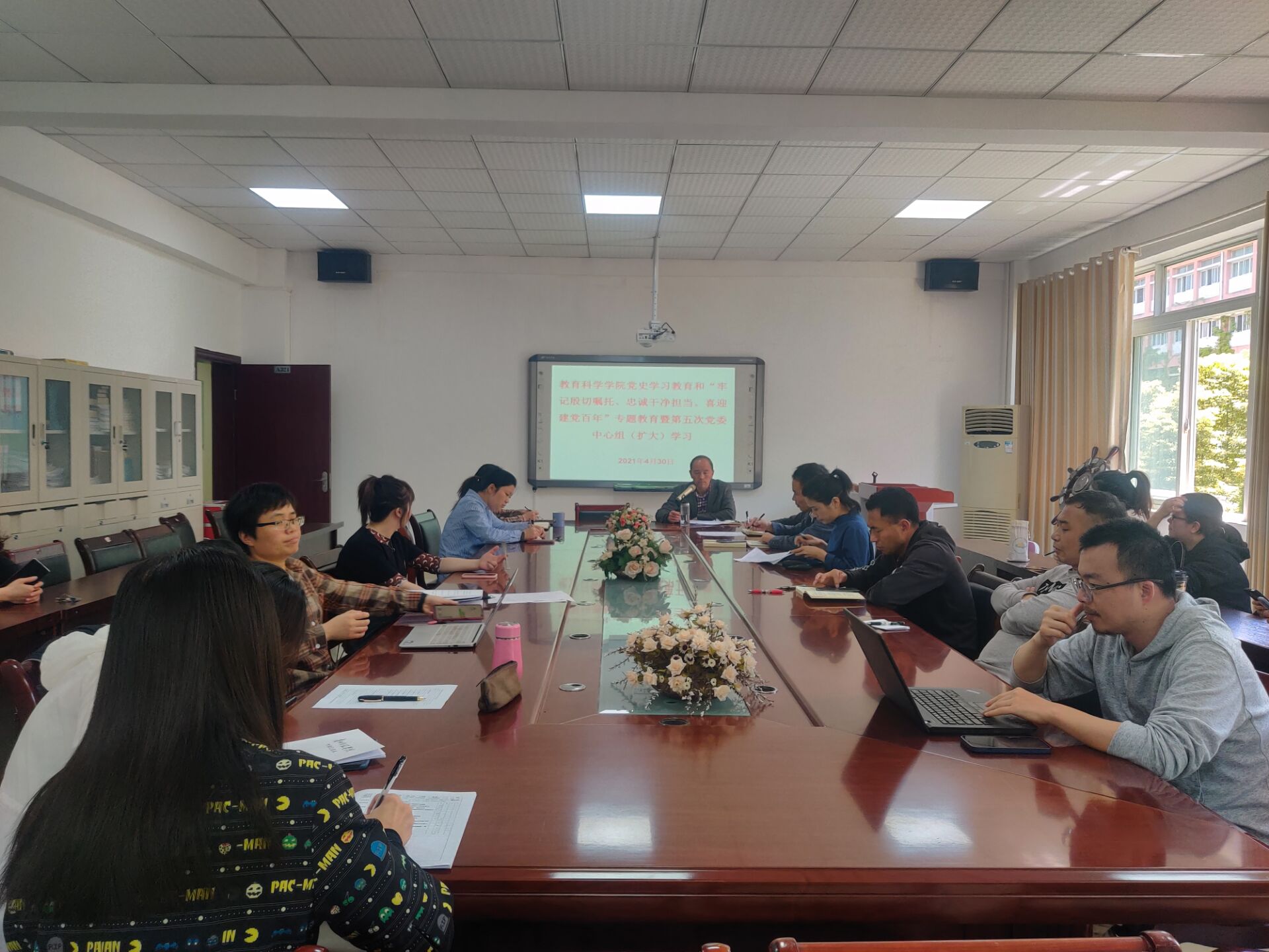 2021年4月30日中午1:00,bevictor伟德官网在逸夫楼会议室举行党史学习教育和“牢记殷切嘱托、忠诚干净担当、喜迎建党百年”专题教育暨第五次党委中心组(扩大)学习,公司党委书记彭祥友主持,公司党委中心组成员参加,全体教师党员列席学习。