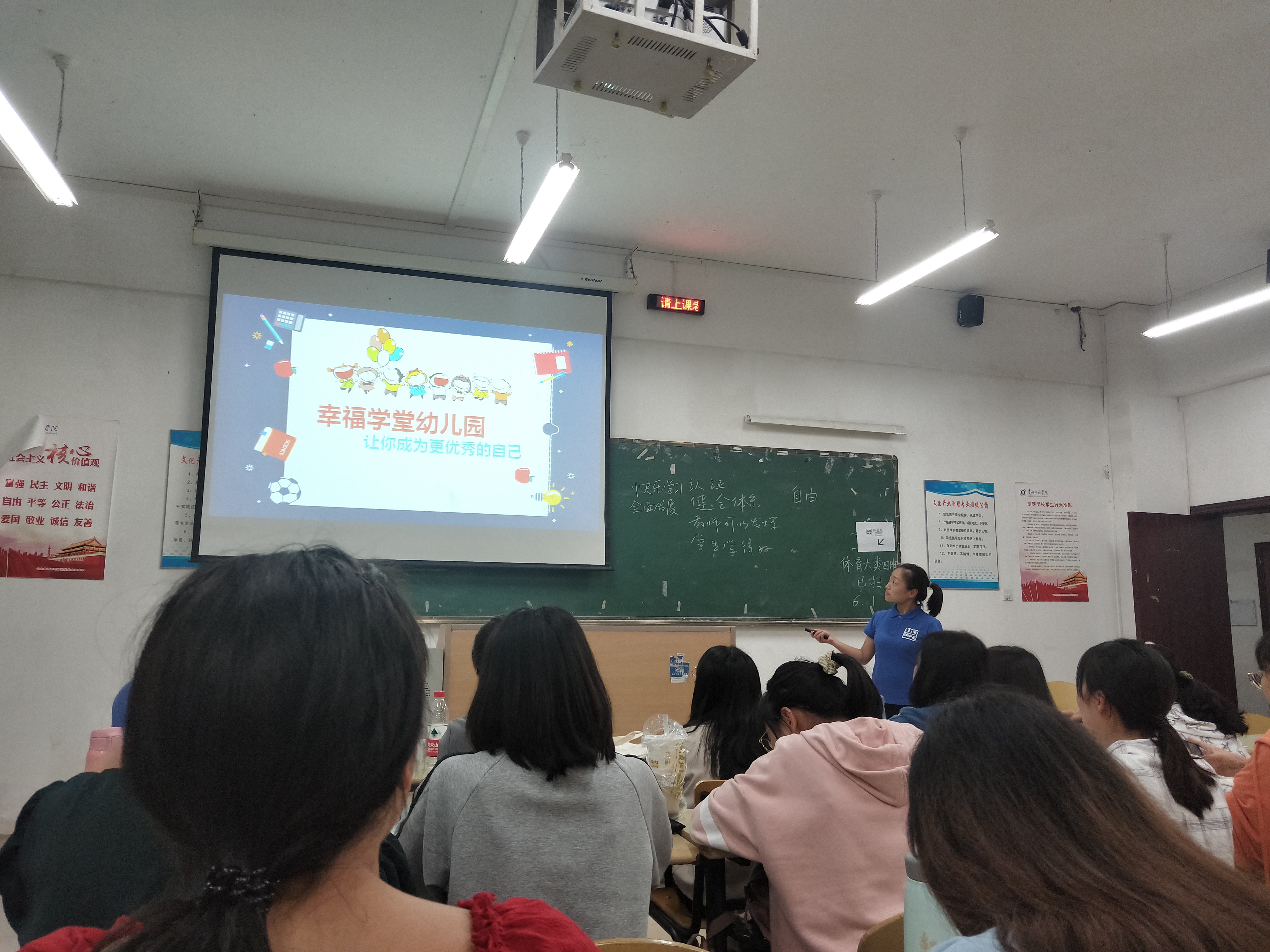 首先,由学前教育系的肖筱晓同学给大家简单介绍了今天的主题,以及来到此次讲座的三个老师。颜董事长先进行了自我介绍,提出幸福学堂的发展、课程模式及教育理念。幸福学堂不接受完全的应试教育,尊重儿童个体差异性,营造轻松的氛围,让孩子在快乐与自由的环境中茁壮成长。颜董事长图文并茂的展示了幸福学堂的社会公益,体育课等多种多样的活动,并给予了同学们答疑解惑的机会。讲解了不同问题的具体解决方案以及解决思路,并在互动讨论中告诉同学们,教育对人产生作用,且儿童受教育年龄越小,越早越好。成为一个好老师应该对教育有追求,有天赋以及自然而然的爱。第二个老师是幼儿园园长,为我们介绍了幼儿园的真实案例,课程模式以及课程来源,也给了同学们提问的机会。