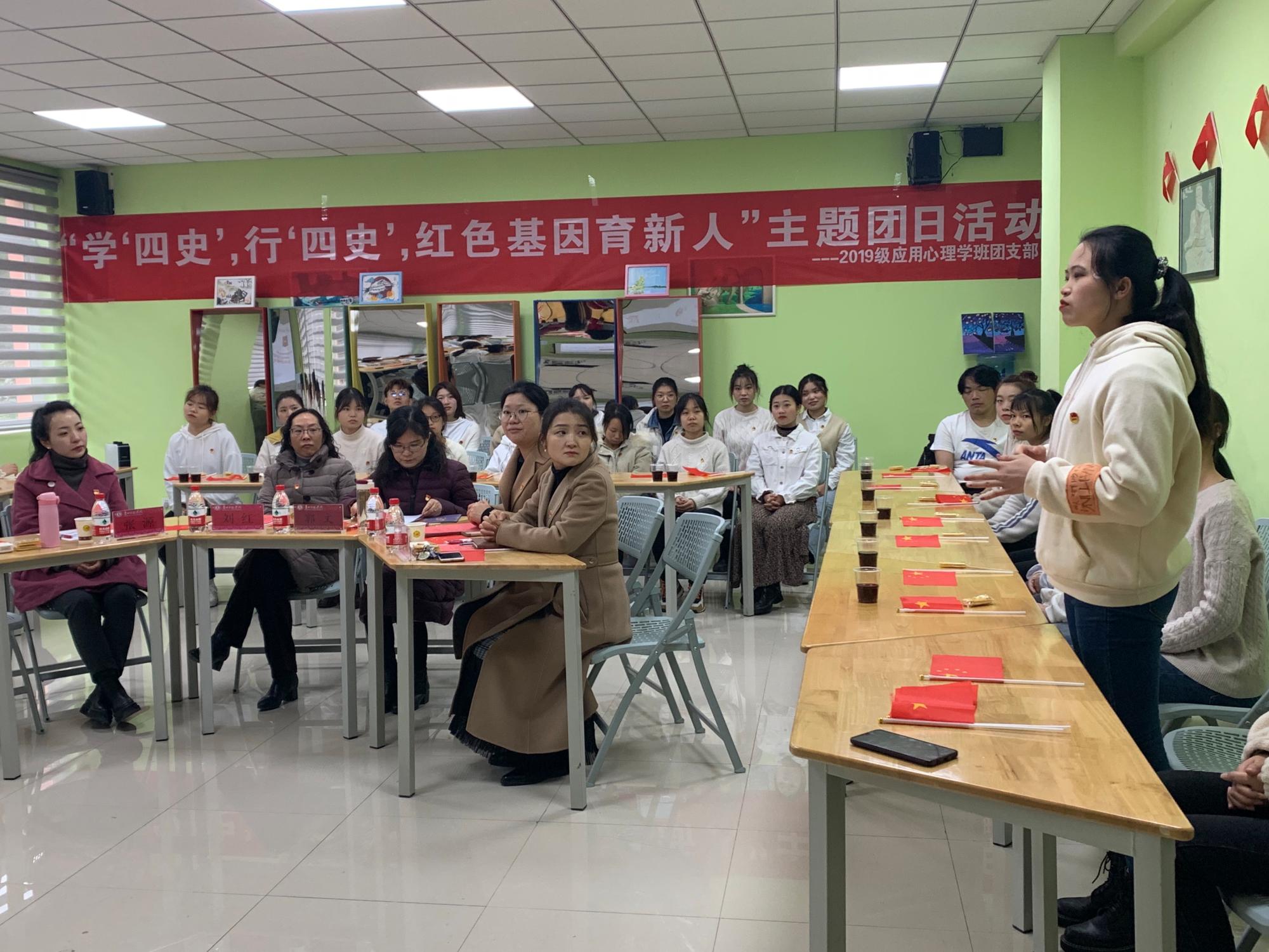 为深入贯彻落实习近平总书记关于学习党史、新中国史、改革开放史、社会主义发展史的重要指示精神,引导广大团员青年树立崇高理想,增强团员青年的使命意识。2020年12月4日上午,bevictor伟德官网2019级应用心理学班团支部在逸夫楼215教室开展了关于“学‘四史’,行‘四史’,红色基因育新人”的主题团日活动。公司党委副书记郭文、bevictor伟德官网经理刘红、党委副书记傅小芳、团委书记张源、辅导员鲁蓓蓓老师出席了此次活动,2019级应用心理学班团支部全体团员参加了此次活动。活动由团支部成员赵洪洪和刘蓉蓉两名同学主持。