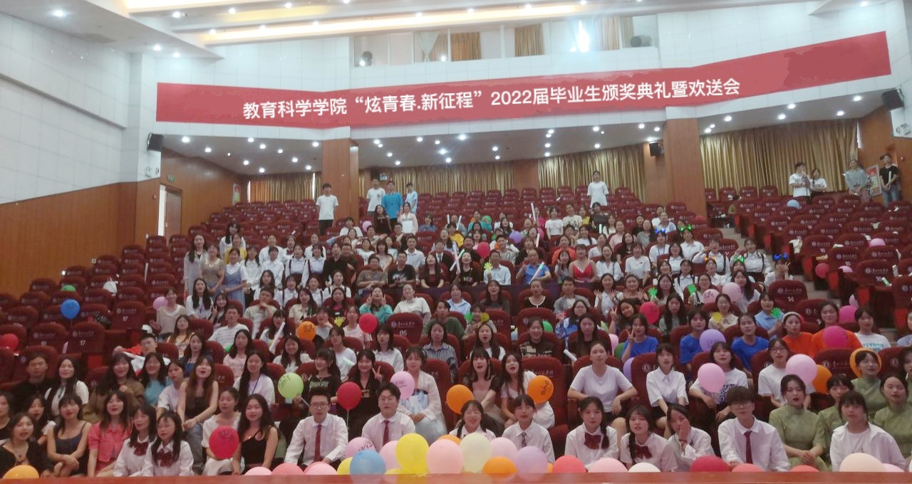 员工会同学们开场舞拉开序幕,首先进行的是毕业生颁奖典礼。欢送会主要分为踏逐韶音、筑梦年华、羁旅青春三个序章。首先,20学前教育班和19艺教班带来的《快乐星猫+送你一朵小红花》手势舞展现了青年的蓬勃力量,激励着同学们不畏困难,勇往直前;21级学前教育班的同学们带来的《年少有你》情景剧重温了过去的岁月,仿佛将同学们带回了他们拖着行李、满怀期待踏入贵师院的那天,又憧憬了美好的将来;21艺教班李军同学带来的独唱《归还自我》,激励了全体毕业生在逐梦路上勿忘保持初心和自我。最后,由全体演职人员及在场全体同学共同合唱歌曲《这世界那么多人》,把欢送会推向了最高潮;晚会结束后,全体师生一同拍照进行留念。