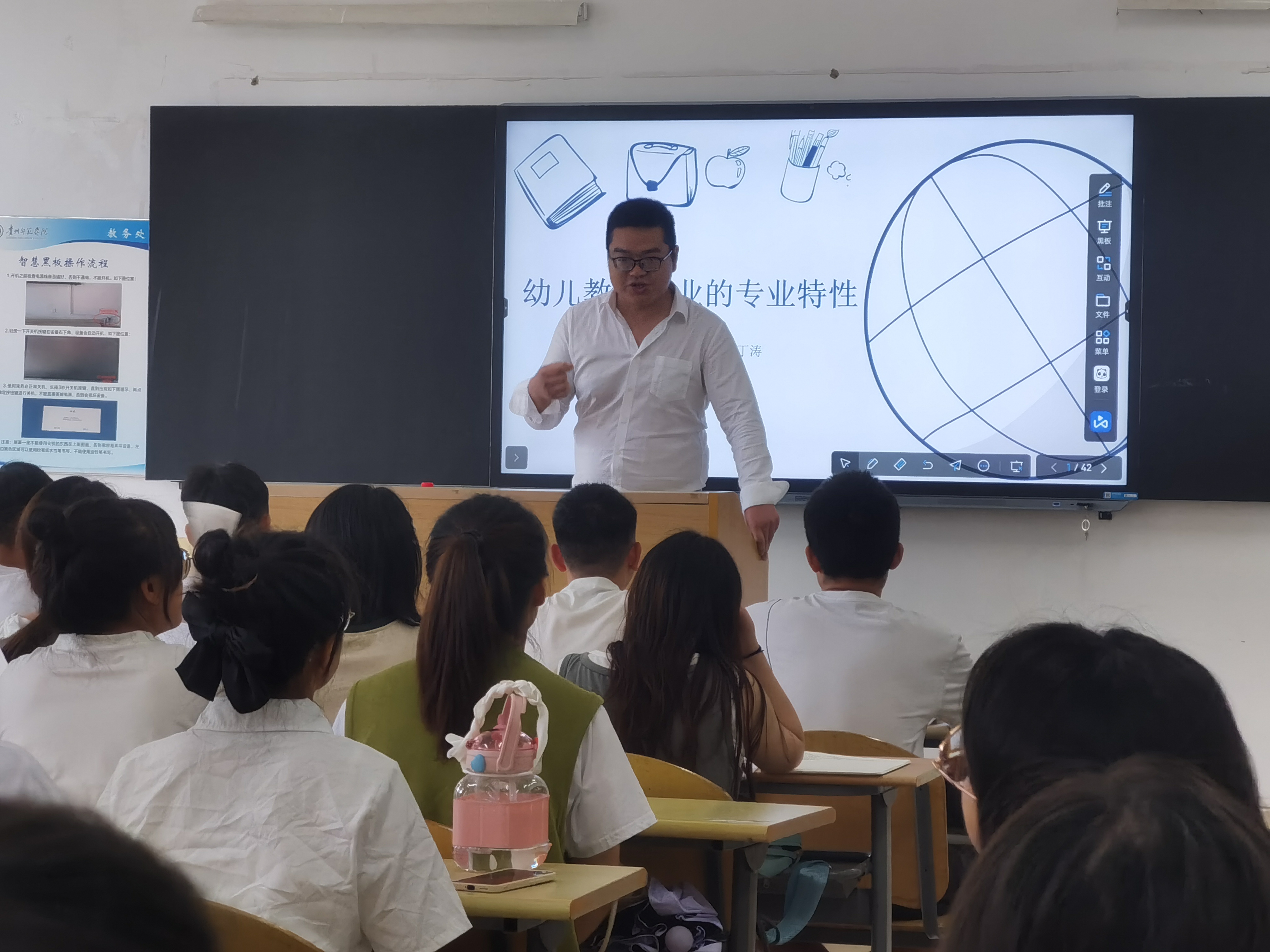 7月1日,贵州省乡村名师、本专业2013届毕业生、修文县六广镇幼儿园教师丁涛,应邀为2019级学前教育专业本科生做了题为《幼儿教师职业的专业特性》的讲座,此次活动在逸夫楼202教室开展,2019级共计110名员工参与其中,2019级学前教育一班学习委员欧志标主持此次活动。