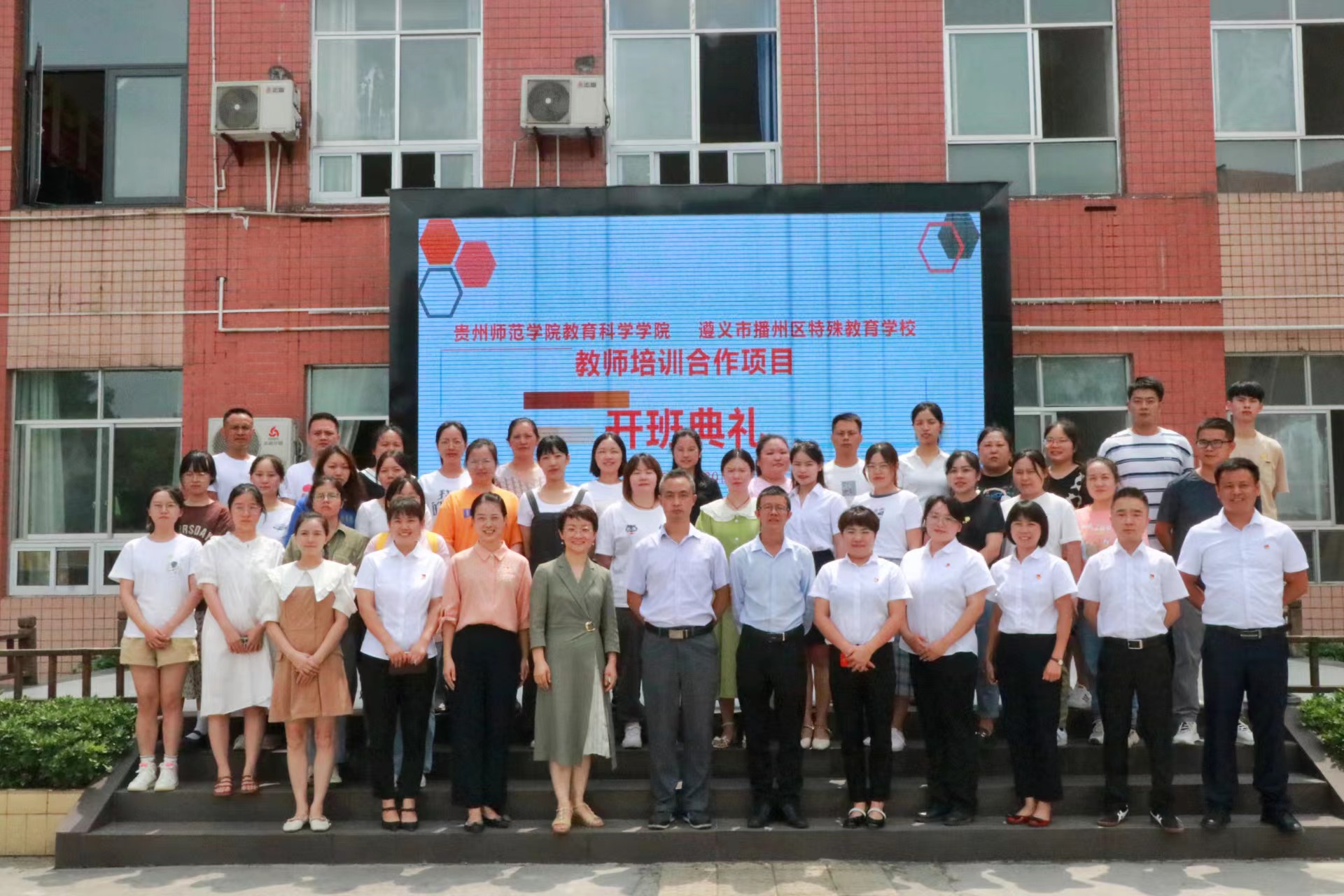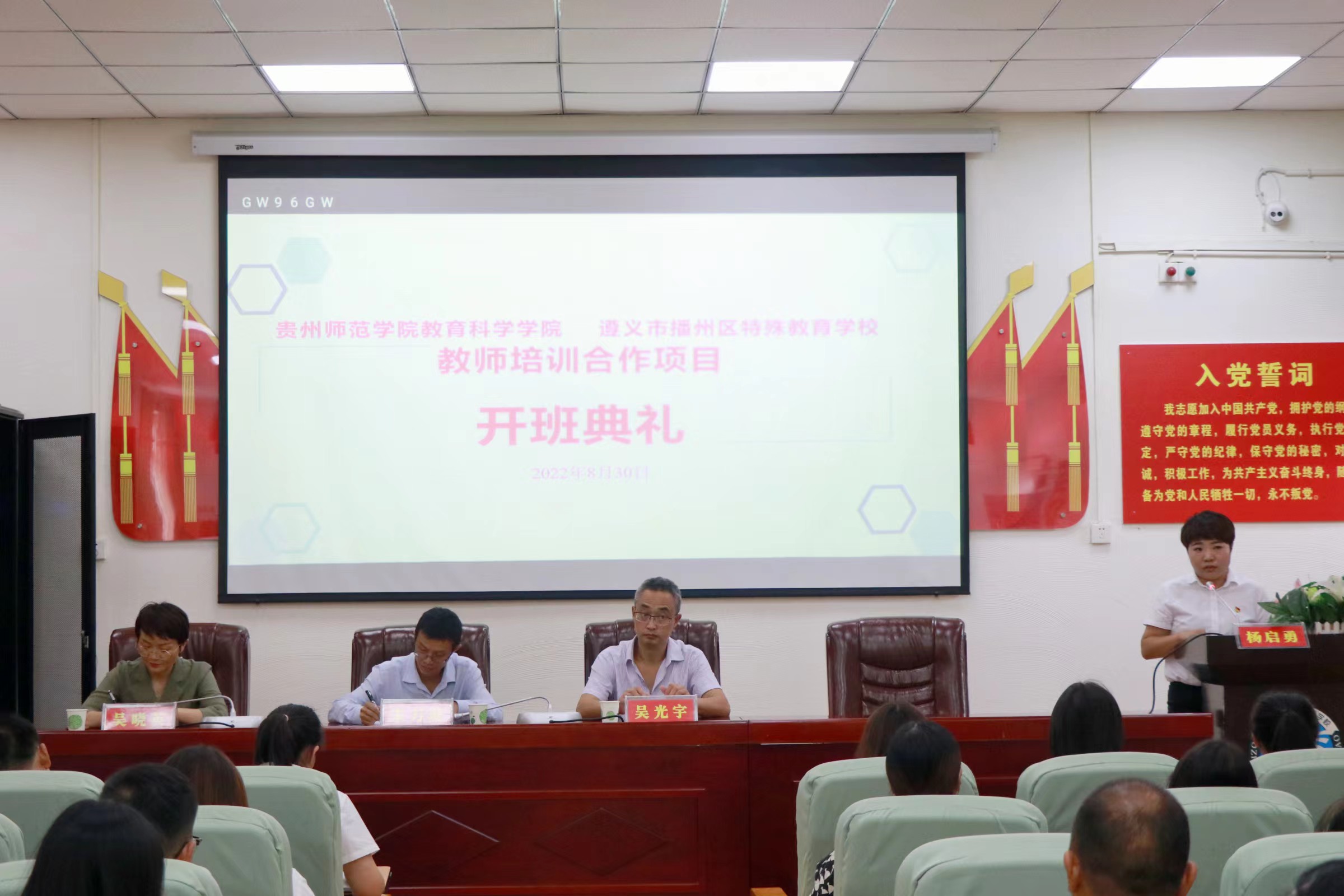 2022年8月30日下午,遵义市播州区特殊教育公司与bevictor伟德官网教师培训项目开班典礼在播州区特殊教育公司举行。参会的人员有bevictor伟德官网宋万琚经理、吴晓英博士、播州区人民政府教育督导室督学吴光宇、播州区特殊教育公司的全体教师以及片区的教师代表等,会议由播州区特殊教育公司董事长杨启勇主持。