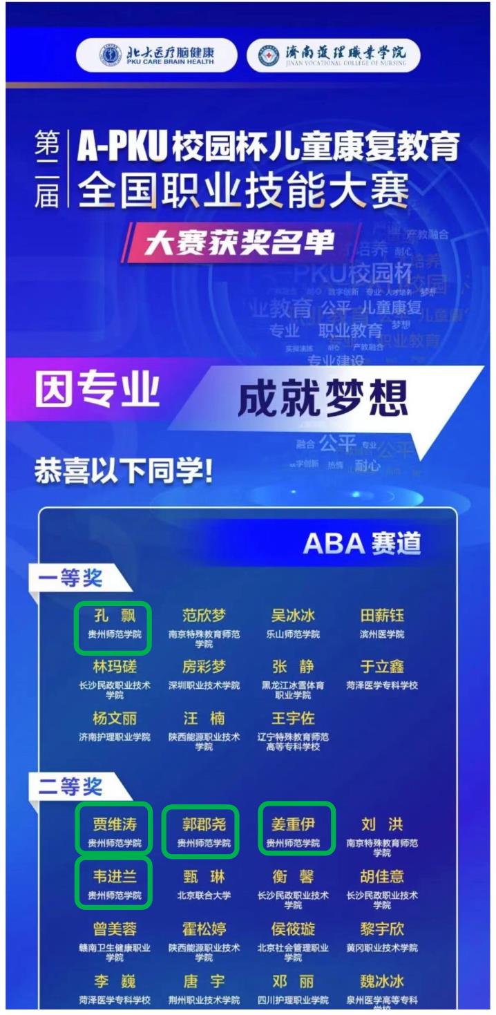 大赛从2022年3月启动至今,吸引了全国超120所院校,6500名员工参加,经过半年多的角逐,在公司特殊教育系教师田婧、朱紫桥带队指导下,特殊教育系5位同学通过初赛、复赛的层层选拔,最终杀入决赛。在决赛中,公司学子表现优异,其中孔飘(19级特殊教育)获得ABA赛道全国一等奖(排名第一),贾维涛、郭郡瑶、韦进兰(19级特殊教育)、姜重伊(20级特殊教育)获得ABA赛道全国二等奖的好成绩。同时,两位带队老师朱紫桥、田婧荣获优秀指导教师奖。