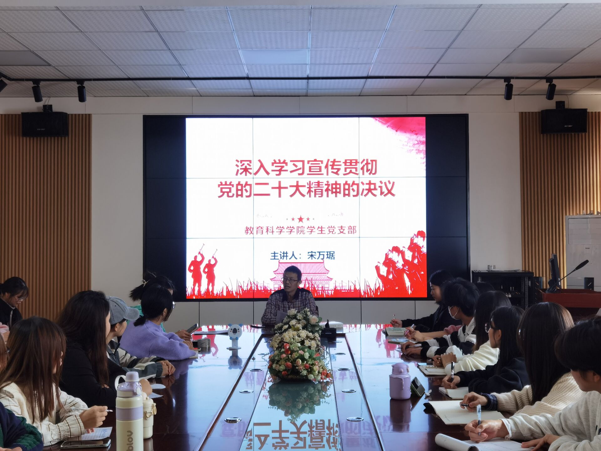 本次专题主要学习党的二十大精神。首先,宋万琚强调要充分认识党的二十大的重大意义,党的二十大是在全党全国各族人民迈上全面建设社会主义现代化国家新征程、向第二个百年奋斗目标进军的关键时刻召开的一次十分重要的大会,事关党和国家事业继往开来,事关中国特色社会主义前途命运,事关中华民族伟大复兴,在党和国家发展进程中具有重大现实意义和深远历史意义。其次,我们要坚定拥护“两个确立”、坚决做到“两个维护”。党确立习近平同志党中央的核心、全党的核心地位,确立习近平新时代中国特色社会主义思想的指导地位,是党在新时代取得的重大政治成果,是推动党和国家事业取得历史性成就、发生历史性变革的决定性因素,是党和国家事业兴旺发达的根本保证,是党应对一切不确定性的最大确定性、最大底气、最大保证。最后,希望同学们持续兴起学习宣传党的二十大精神热潮。全省各级党组织要把学习宣传贯彻党的二十大精神作为当前和今后一个时期首要政治任务,精心组织、周密部署,既要整体把握、全面系统,又要突出重点、抓住关键。要把着力点聚焦到习近平总书记是党中央的核心、全党的核心,习近平新时代中国特色社会主义思想是党必须长期坚持的指导思想上。