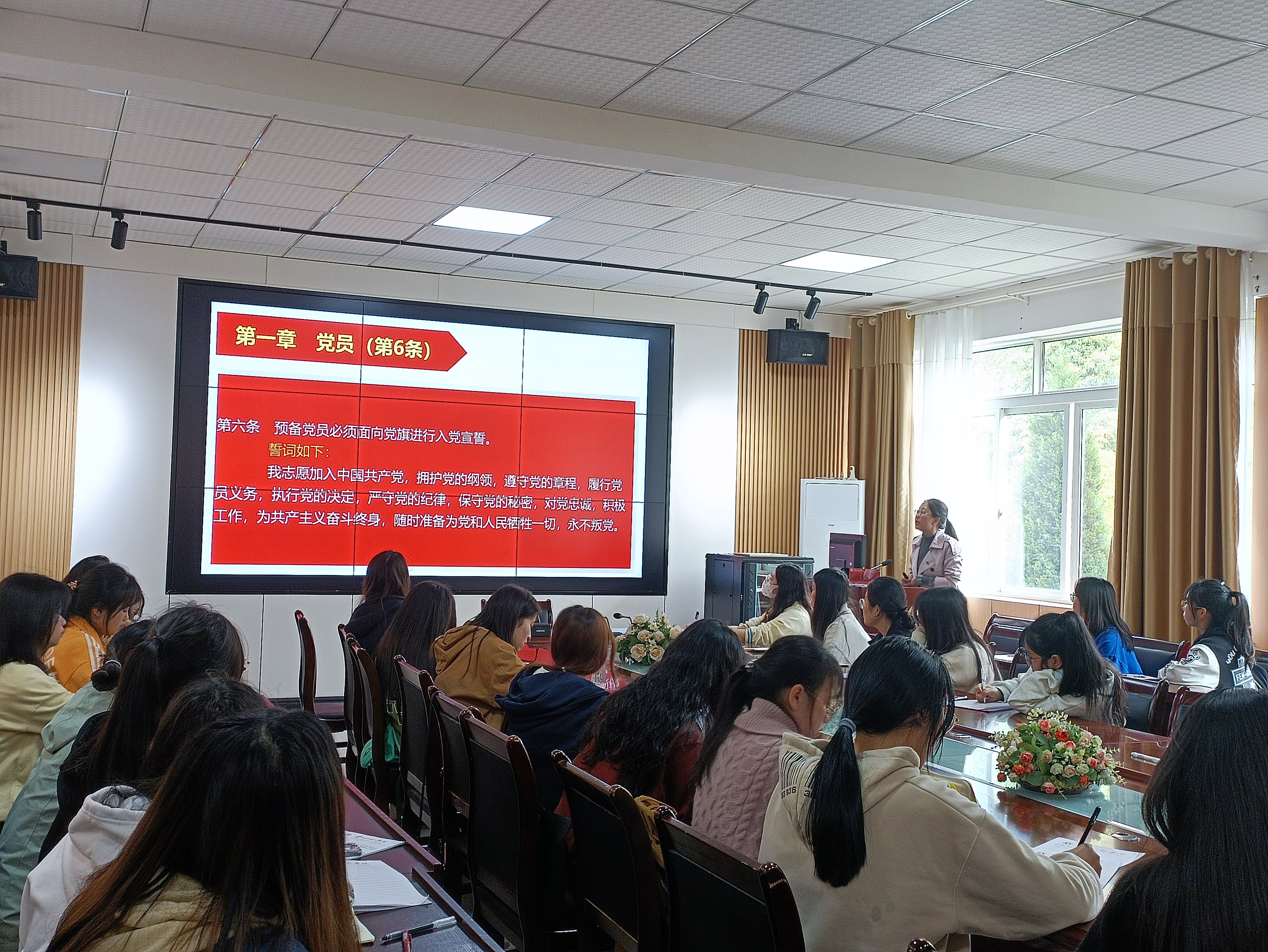 开班典礼结束后,肖湘萍以《中国共产党章程》为主题进行授课。首先她以党的二十大为引,向同学们提问。随后,从习近平新时代中国特色社会主义思想、党章的概述、党章的发展历程、学习党章等六个方面,向大家介绍了《中国共产党章程》。最后,她希望同学们从中认识到党章的涵义,将其作为自己行动的标杆和指南,对党和党员有一个更加全面的认识。
