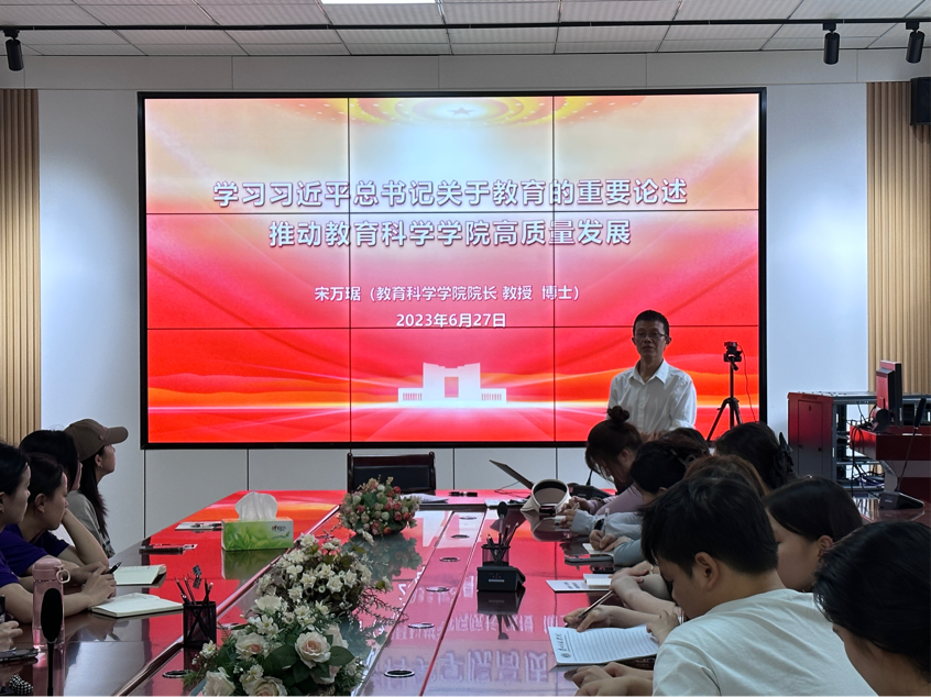 宋万琚以分享与讲授相结合的方式进行授课,就“习近平总书记关于教育的重要论述”中“为什么办教育、办什么样的教育、怎么办教育、为谁办教育、谁来办教育”一系列方向性、全局性、战略性问题重点讲解,提出作为教师应当树立正确的人生观和价值观,教育者应根据不同专业培养专业性人才。宋万琚认为同学们必须满足“理想信念、道德情操、扎实学识、仁爱之心”好老师的标准,无论从事任何工作都要有“四有”好品德,以此来推动自身发展。宋万琚还带领同学们深入学习了揭示新中国特色社会主义教育发展规律的“九个坚持”。