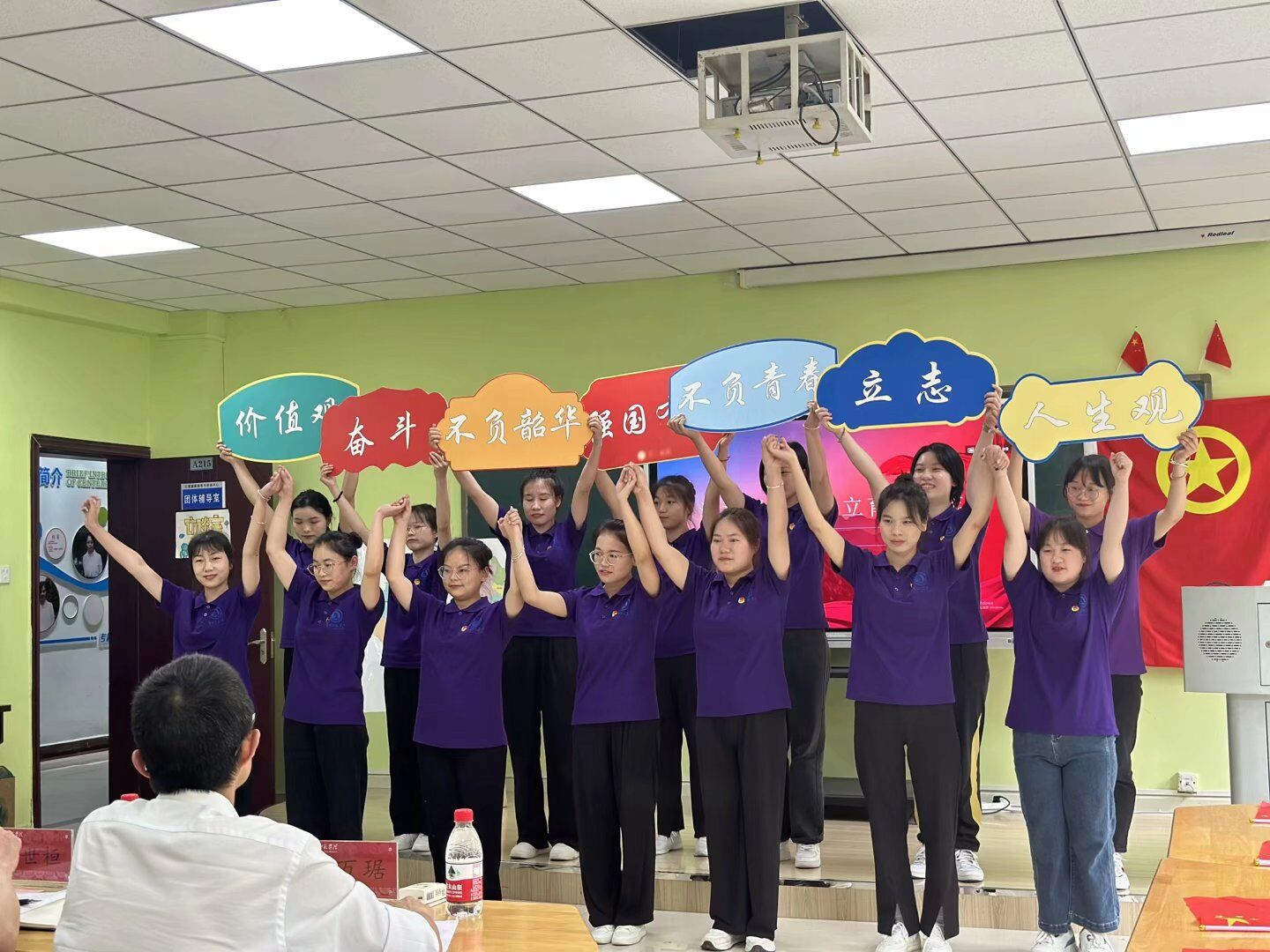 一曲手语舞《和你一样》拉开了本次主题团日活动的序幕;接着,主题团日活动进入现场展示阶段,在“榜样说”模块,团员青年吴晶晶、周发撰和贾梦丹围绕“四有”好老师的标准,分享了张桂梅、刘秀祥和高春英三位老师的故事;接着,特殊教育青年学子围绕“躬耕教坛,强国有我”主题,向党发出了铮铮誓言,彰显了青年团员爱国爱党、勇于进取、敢于创新的青春活力;在“青年说”版块,团员青年们就“爱而无碍,爱而有方”专业主题,现场展示了特殊教育专业技能,紧接着,同学们利用自制的中国盲文地图,结合自己的未来规划,分享了自己未来的人生规划,发出了“要将青春之花开遍祖国大地”的最强音;随后,在现场展示活动“总书记说”中,全体人员观看了习近平总书记有关青年寄语的视频,让同学们备受鼓舞;最后全场齐唱《光荣啊!中国共青团》,嘹亮的歌声响彻全场。