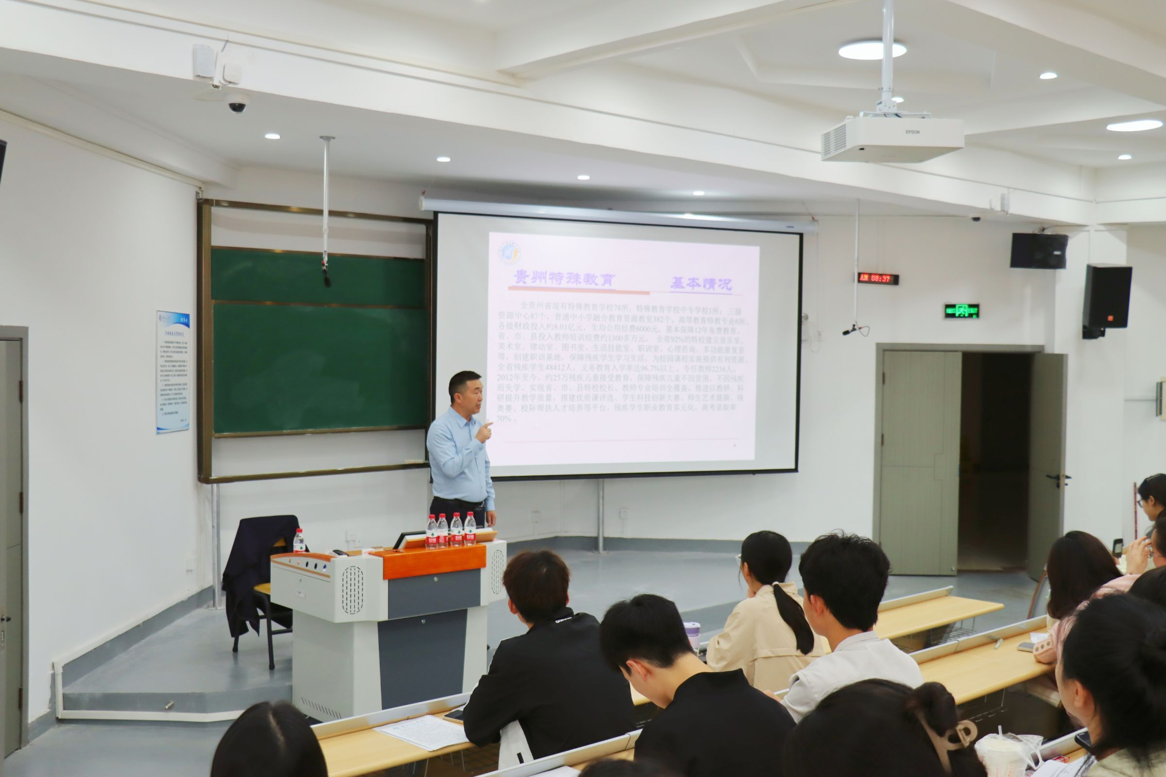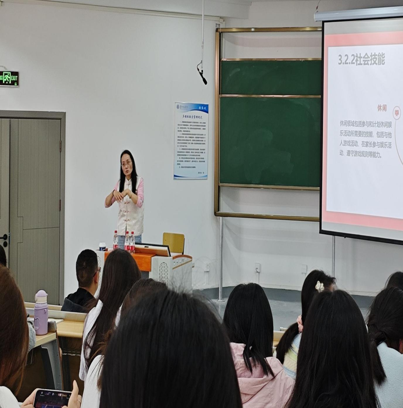 为进一步提高特殊教育系员工的教师需要的知识与实践技能,了解更多的特殊教育公司课程、教学、班级管理和教师的实践工作现状,2024年6月3日,特殊教育系邀请了遵义市特殊教育公司董事长余贞文、刘晓敏2位教师,在宁静楼535为特殊教育系2023级、2022级、2021级特殊教育专业全体员工分别做了《特殊教育公司教师职业素养现状与提升策略》和《孤独症儿童融合教育实践策略》的主题讲座。