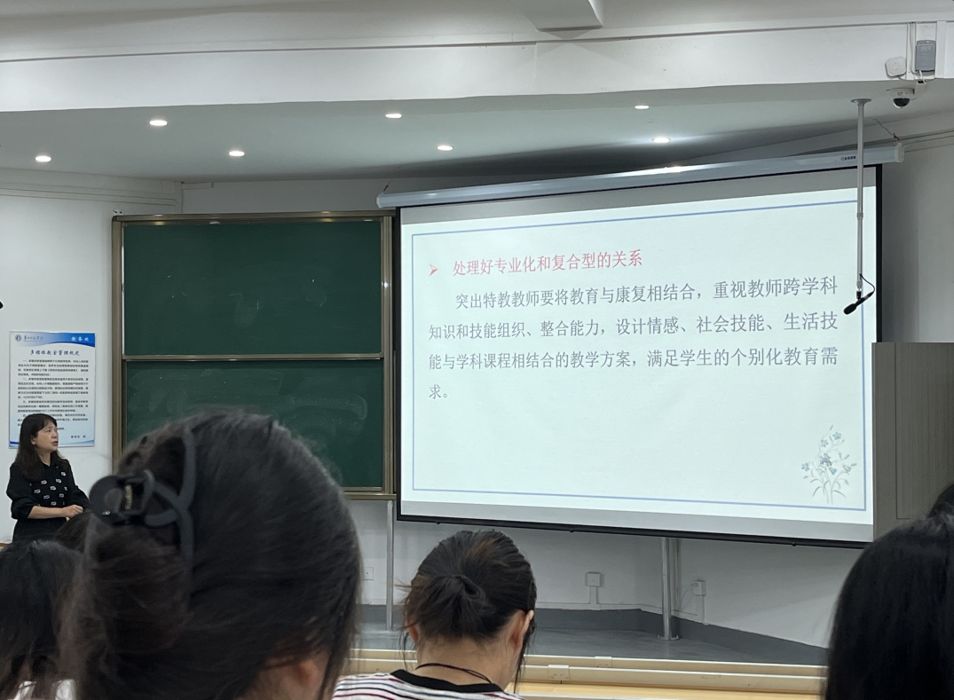为进一步提高特殊教育系员工的教师需要的知识与实践技能,了解更多的特殊教育公司课程、教学、班级管理和教师的实践工作现状,2024年6月7日,特殊教育系邀请了遵义市特殊教育公司正高级教师王杨以及威宁特校教务处主任吕伟教师在宁静楼536 为特殊教育系 2023级、2022级、2021级特殊教育专业全体员工分别做了《未来特教教师必备的核心素养和关键技能》和《区域特殊教育教研活动推进现状、问题和策略》的主题讲座。
