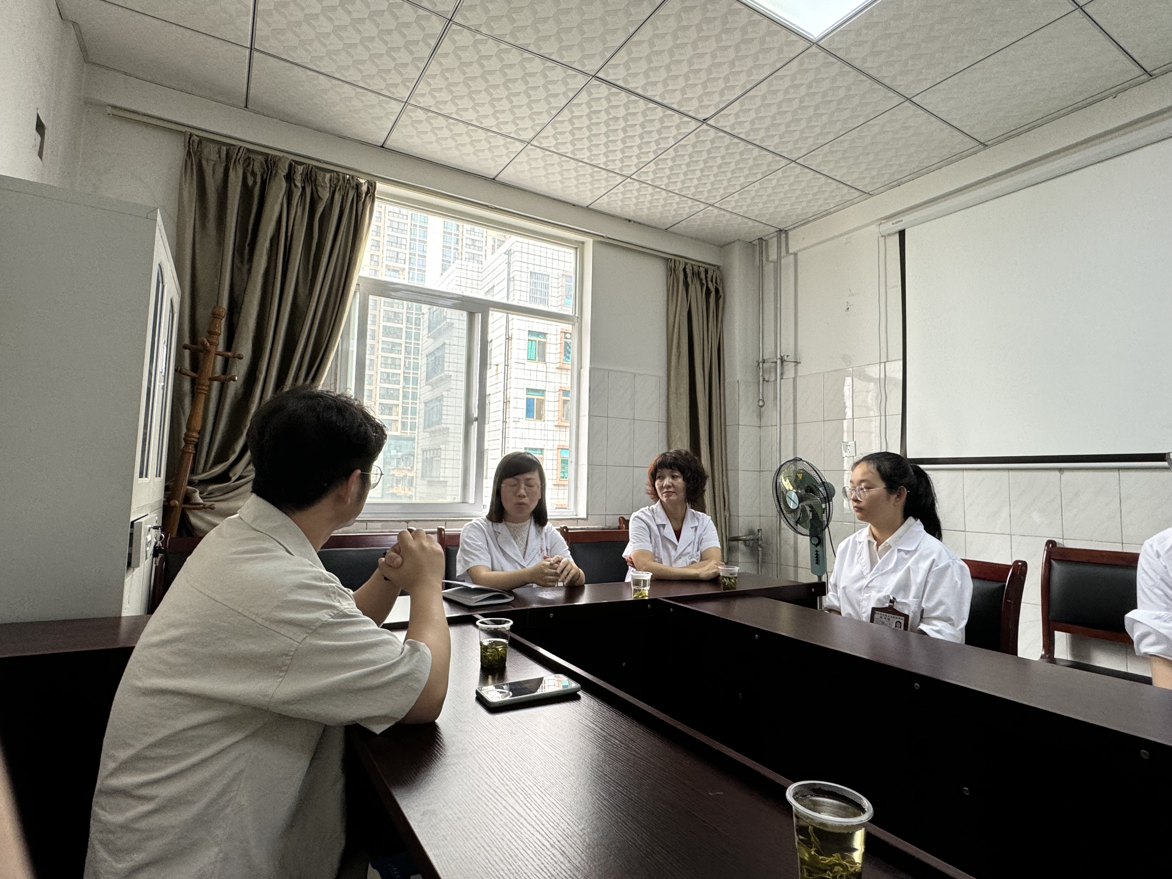 期间,同学们根据贵阳市第五人民医院的王主任的讲解,深入了解了科室的日常工作流程。宋医生也介绍了3名同学的实习情况,随后3名实习生各自分享了在医院的实习成长经历和心得。在洽谈后期,双方提议在实习一年期满以后,可以签订协同育人相关协议,并授协同育人基地牌。
