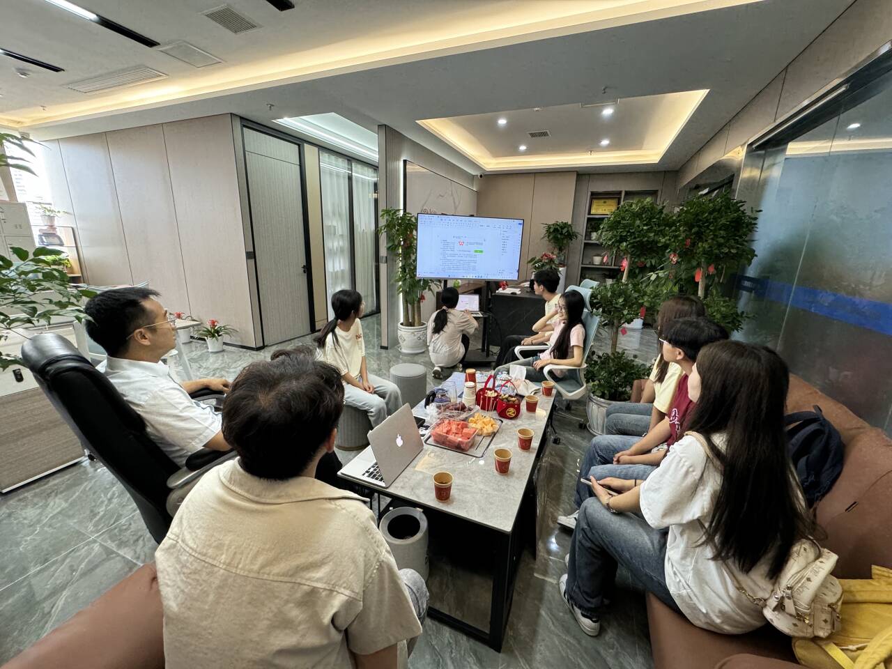 第三站倪磊主任一行来到了万众益心心理健康产业发展有限公司,听取了4位实习生的实习汇报,同时也参观了公司的业务流程等等。
