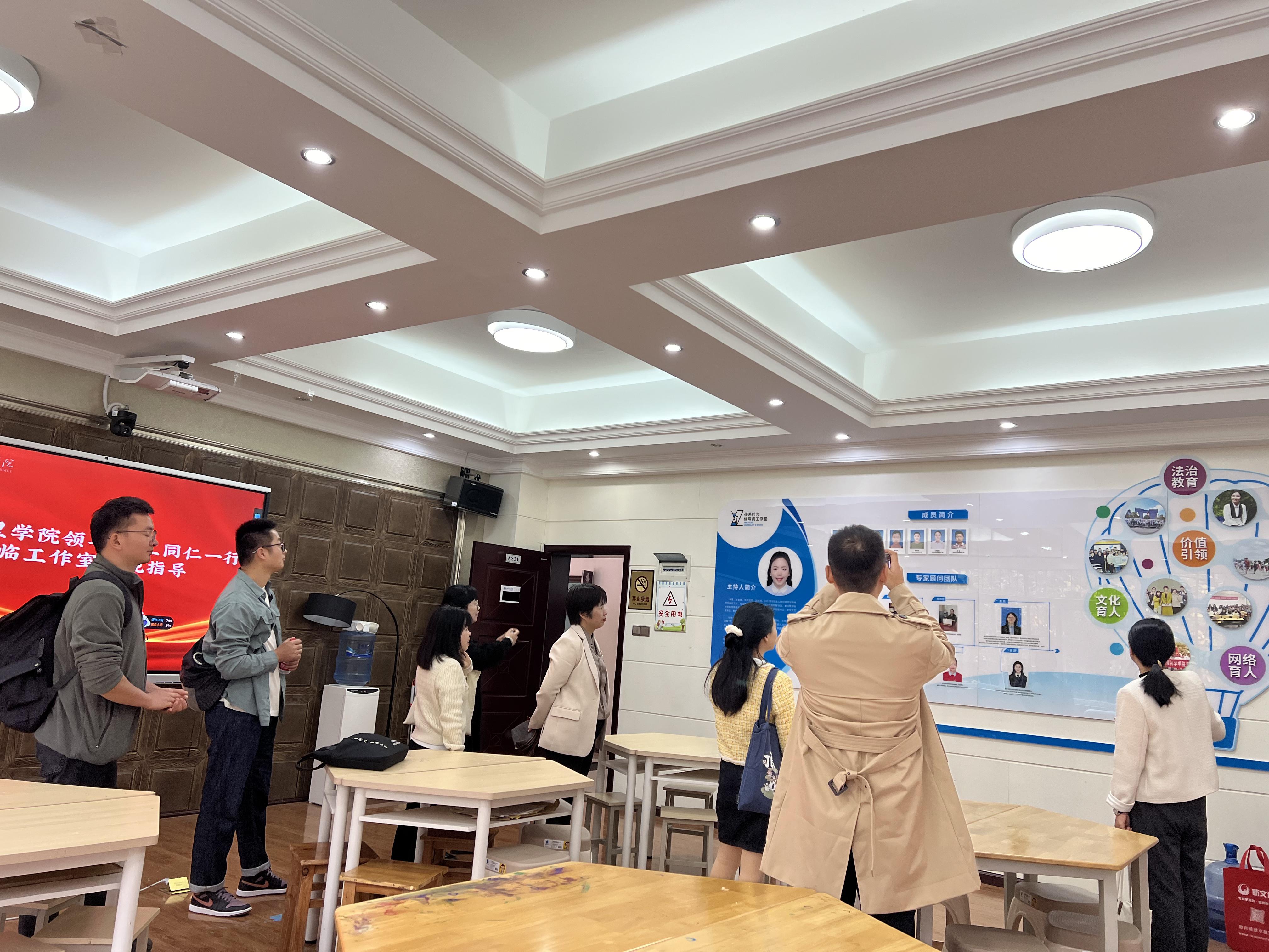 黄梅一行实地走访参观了荏苒时光辅导员工作室,在申苒的介绍下,详细了解工作室的建设方向和服务聚焦,对工作室的基础配套设施、工作室区域功能设计等情况也进行了详尽的了解。黄梅对荏苒时光辅导员工作室自今年4月立项建设以来的快速发展给予充分肯定,并希望能够将工作室建设的经验推广,加强两院员工工作的沟通和交流,打造特色亮点工作,共同推动辅导员工作室的建设。