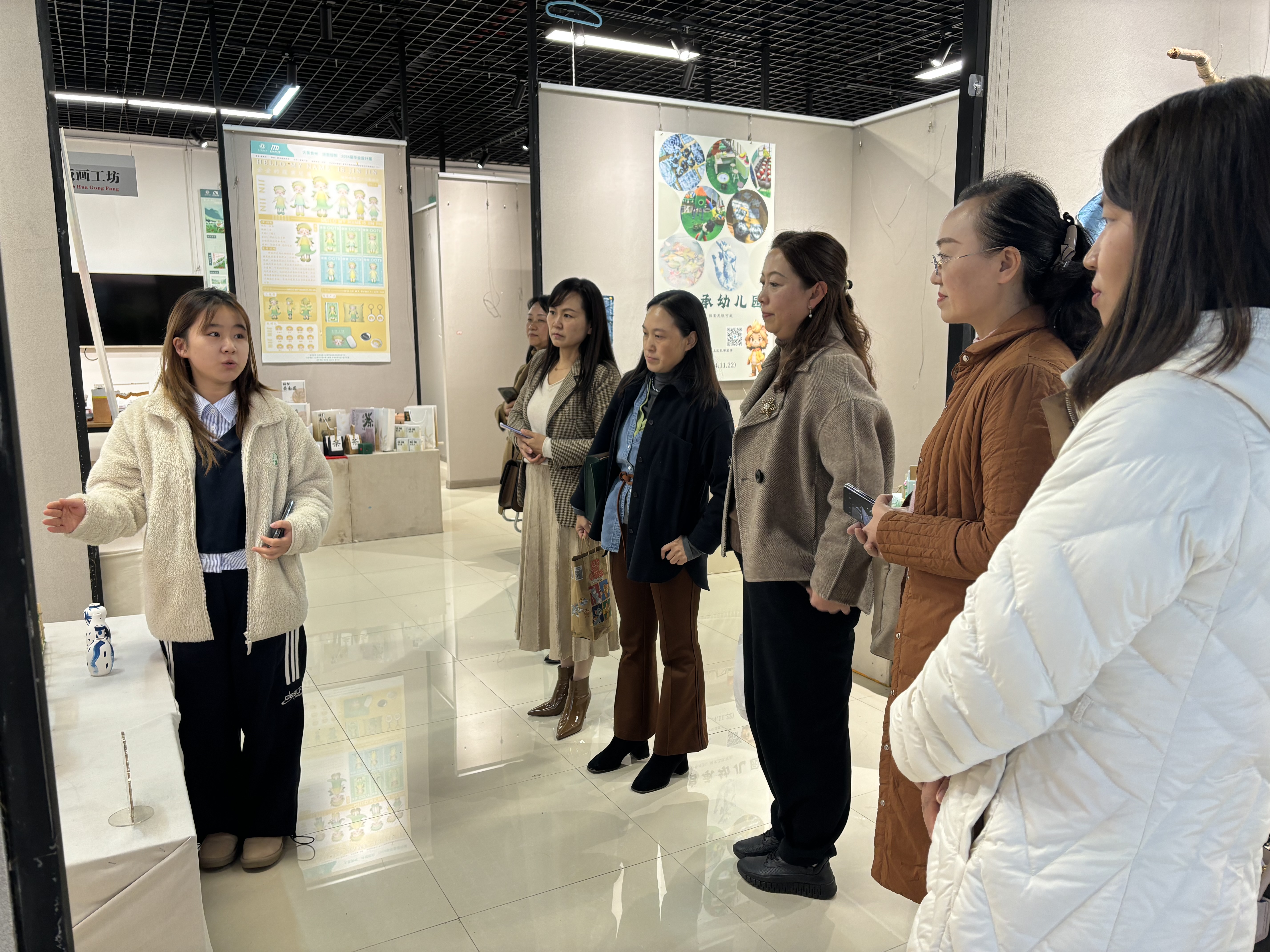 2024年11月21日下午16时,随着温暖的冬日阳光洒满展厅,园长们在课程负责人郑玉莲教授与李姿雨老师的陪同下步入展厅。他们首先被一所所构思巧妙、特色鲜明的幼儿园深深吸引,每走到一所幼儿园前,都驻足细赏,认真聆听讲同学们对所创建的幼儿园的文化、课程、内涵的详细介绍。园长们对同学们展现出的创新精神与深厚专业功底给予了高度评价,并鼓励大家继续探索,创作出更多鲜明特色、符合幼儿发展的优秀作品。