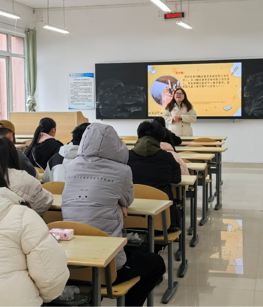 贵州融星教育咨询有限公司负责人李玉玲是公司2021届优秀毕业生,招聘会上,李玉玲详细介绍了机构的教学情况、发展规划和薪资待遇,并结合自身的发展历程与同学们分享了就业心得,动员同学们做好人生规划,在工作中丰富和完善自己,敢想敢做,不断学习和挑战自己。