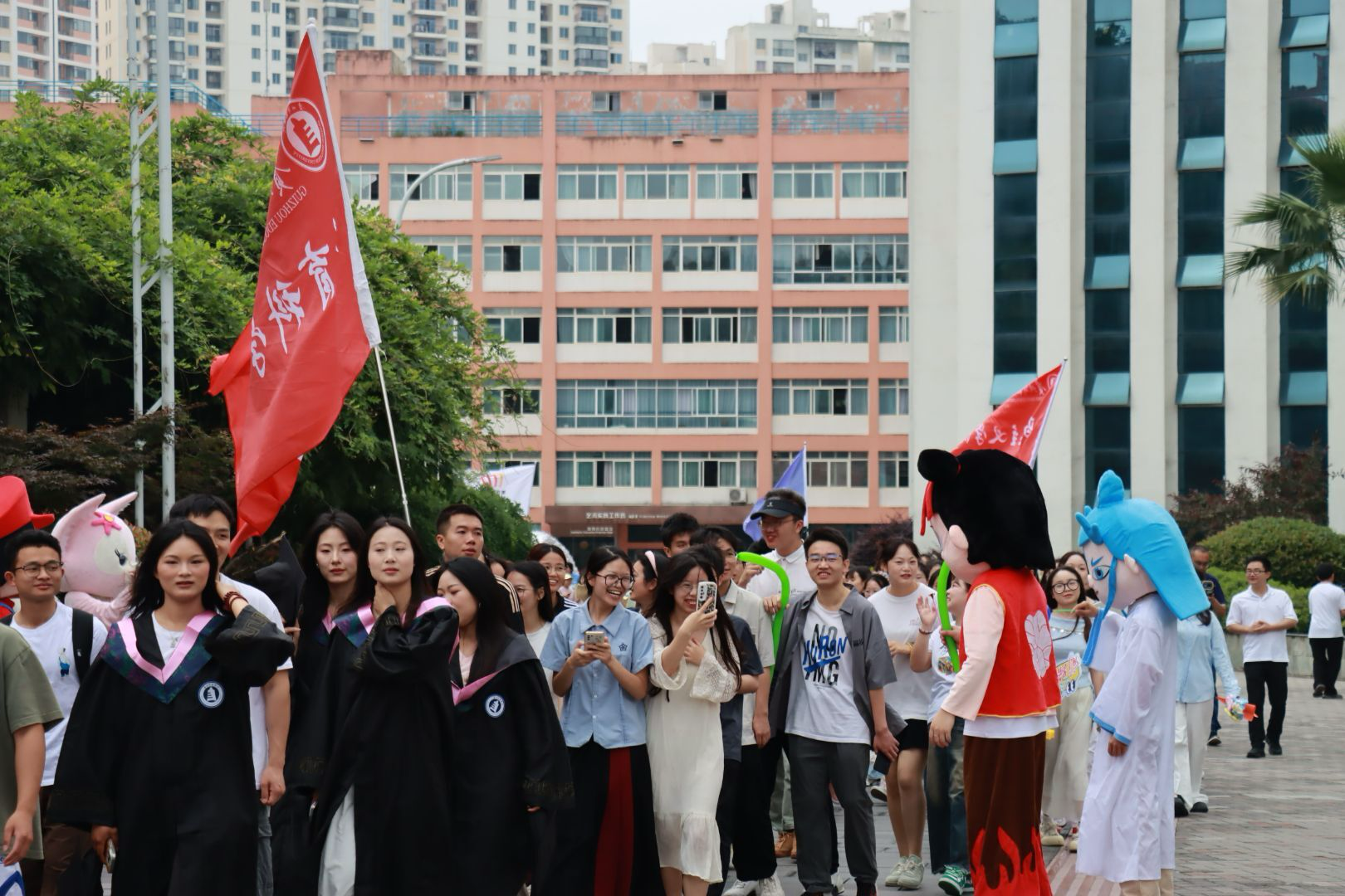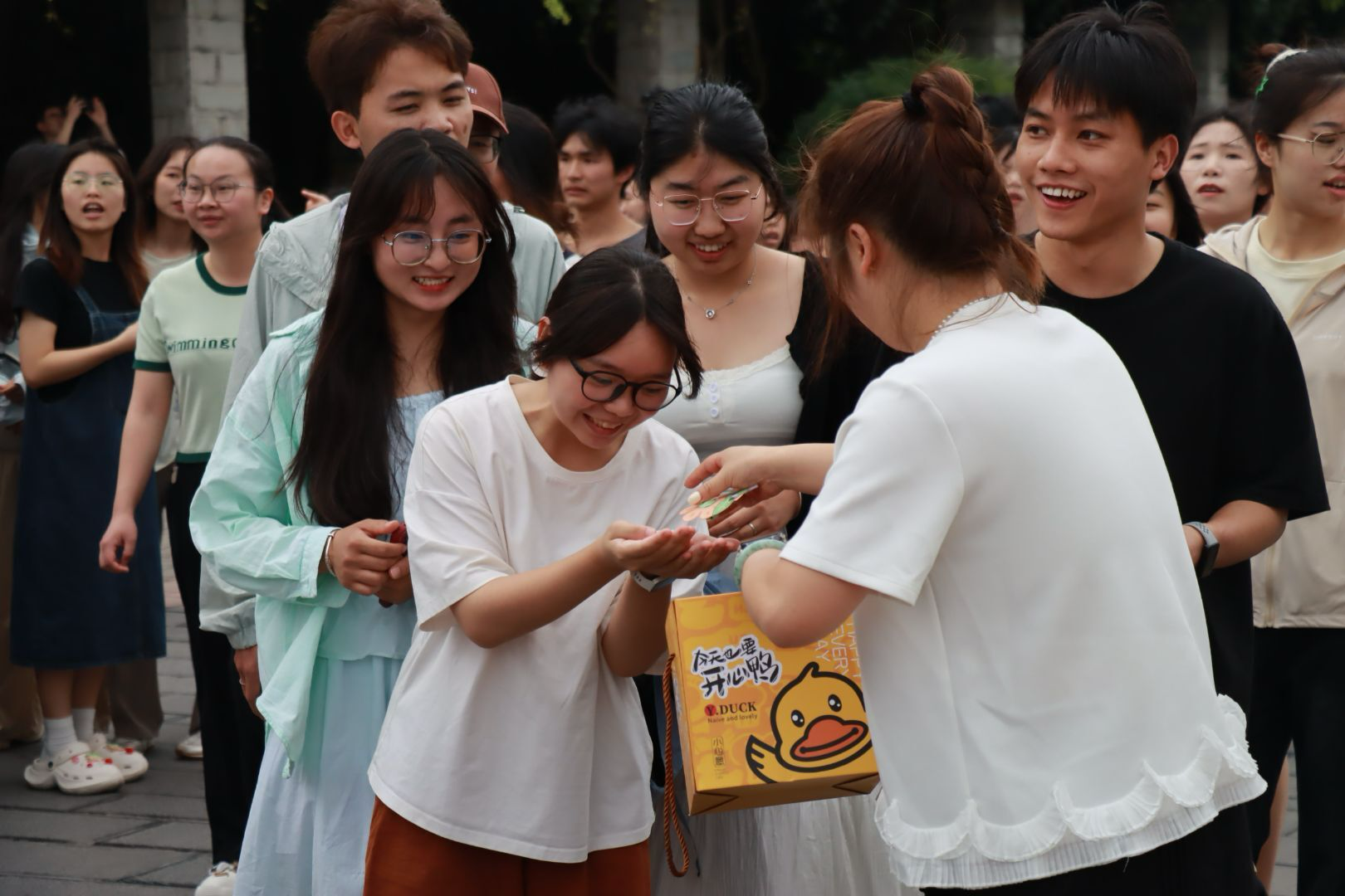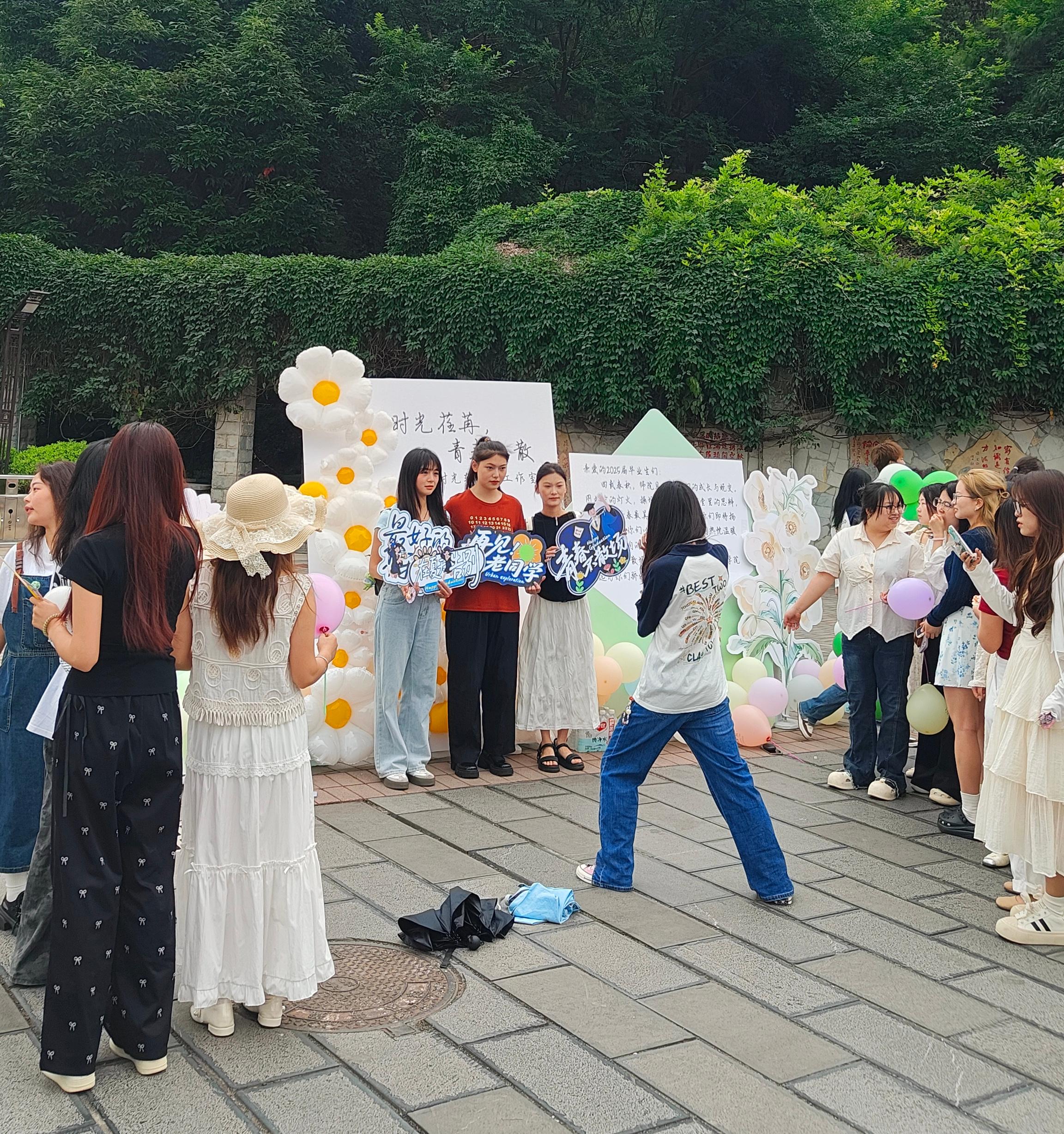 最动人的当属“青春照相馆”的拍立得专区:定制的背景板前,毕业生们或含着棒棒糖手拿“毕业快乐”的立牌,糖纸的沙沙声混着快门的“咔嚓”,即时定格笑容与回忆,让难忘的瞬间化作永恒留念。鉴湖之畔,还有舞蹈节目精彩上演。舞者们用灵动的步伐、热情的演绎,展现出青春的蓬勃朝气,为毕业生们送上一场视觉盛宴,也为校园增添了活力与温情。