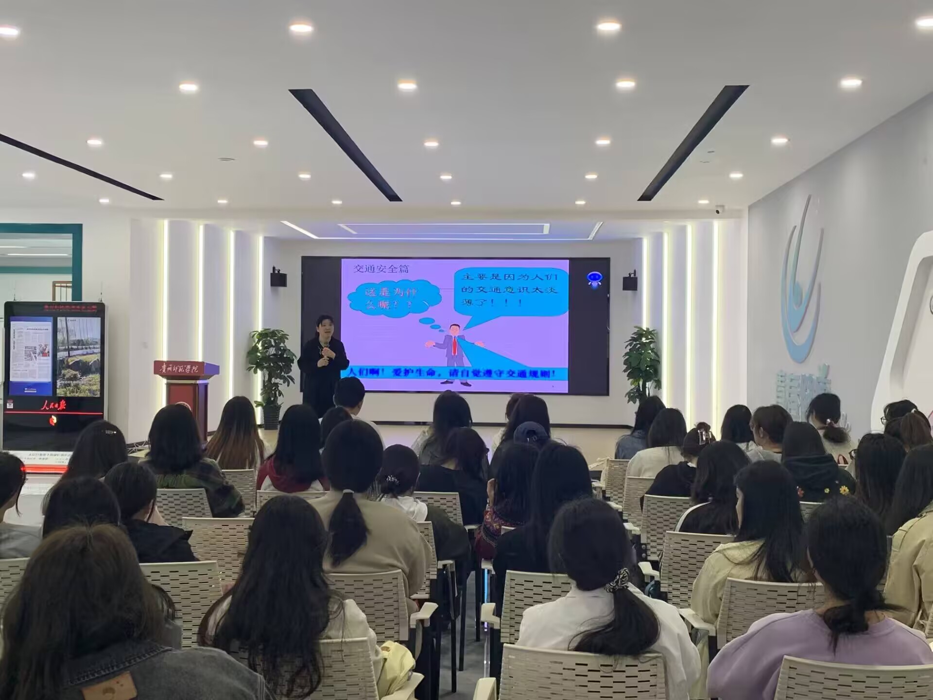 安全主题班会中,傅小芳从多方面的安全问题展开了细致、生动的讲解。第一方面是交通安全教育,告诫同学们要爱护生命,自觉遵守交通规则;第二方面是饮食安全教育,傅小芳结合同学们的日常生活讲解了如何确保食品安全;第三方面是用电安全教育,严禁员工在宿舍违规用电,使用大功率电器,以及发生火灾时员工开展自救的方法;第四方面是防盗教育,讲解了高校盗窃常见作案手段以及“防贼防盗”的措施。