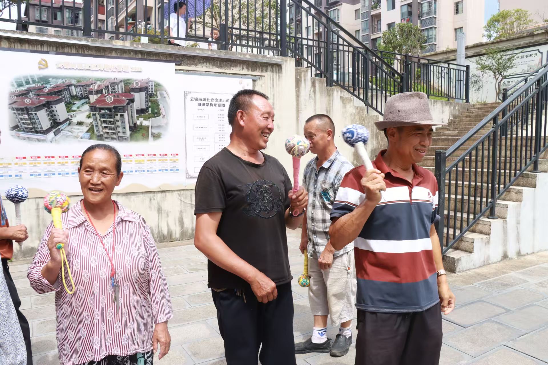 活动伊始,志愿者向大家介绍艾草锤的养生功效与制作步骤。随后,大家分工协作,分发提前准备好材料、填充艾草、缠绕彩绳等。大家凭借丰富生活经验耐心填充艾草,志愿者则细心辅助、创意点缀。制作间隙,有些老人分享往昔岁月里的手工故事,志愿者倾听之余,也交流校园趣事,代际互动在艾草香气与欢声笑语中升温。完成后,大家手持散发淡淡艾香、色彩缤纷的艾草锤,脸上满是喜悦。老年人、残疾人不仅在志愿者的带领下一起用艾草锤敲打八虚,还结伴在社区拍照,定格这份美好。